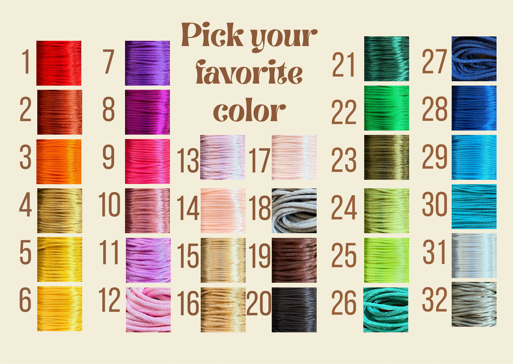 - Het satijnkoord is 2 mm dik. Je kan kiezen uit verschillende kleuren satijnkoord. Er zijn foto’s met alle kleuren satijnkoord bijgevoegd.